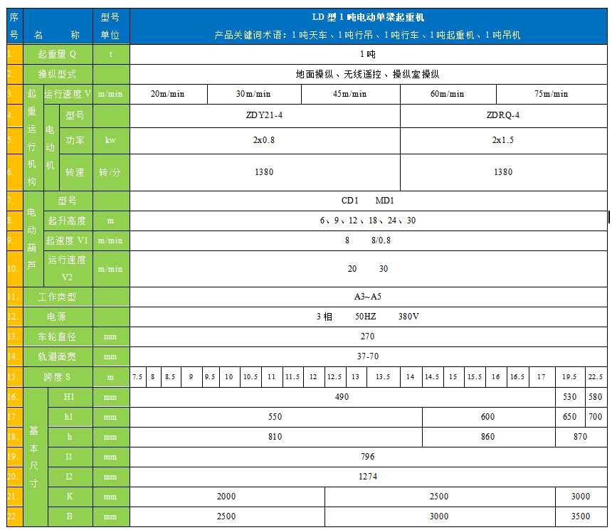 LD型1噸電動單梁橋式起重機(以下簡稱1噸起重機)是按標準JB/T1306-94設計制造的,與CDI、MDI等形式的電動葫蘆配套使用,成為一種有軌運行的輕小型起重機,起重量為1噸,適用跨度為7.5-22.5米工作環(huán)境溫度在—25—+40℃范圍內(nèi)。